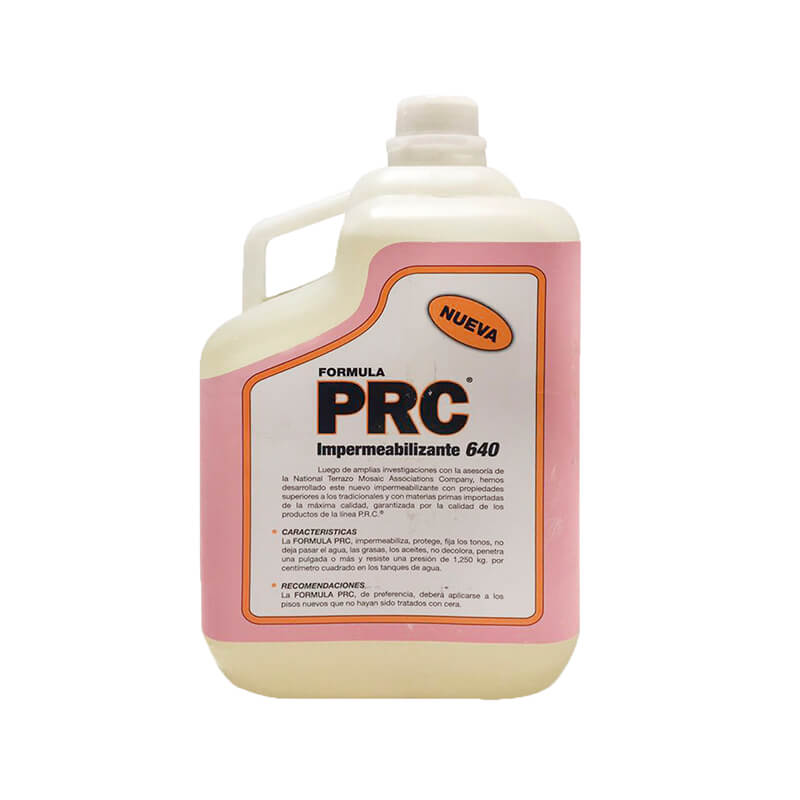 El Sellador Impermeable PRC 640, impermeabiliza, protege, fija los tonos, retarda la absorción del agua, grasas, los aceites, resiste los ácidos y los (aceites) álcalis, no decolora y penetra una pulgada o más. Este Sellador es recomendado principalmente para productos a base de cemento (como Mosaicos Empastados, Terrazo) entre otros acabados.